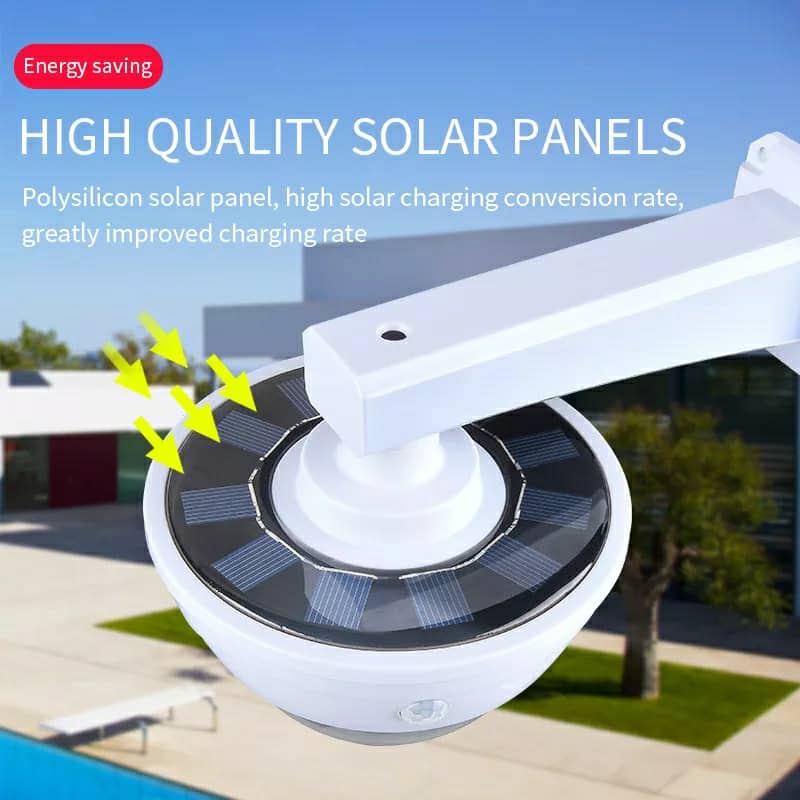 خصائص المنتج:حل أمني بتكلفة منخفضة: مصنوع من مادة ABS عالية الجودة ويشبه كاميرا حقيقية، مزود بحساس استشعار بالأشعة تحت الحمراء، يعمل كإضاءة عند العودة للمنزل ليلاً مع تأثير ردع للصوص والتخريب دون تكلفة الكاميرات الحقيقية.الطاقة الشمسية: مزود بلوح شمسي يشحن البطاريات القابلة لإعادة الشحن (البطاريات مرفقة) نهارًا، ويتوقف عن العمل لتوفير الطاقة، ويعمل تلقائيًا عند حلول الظلام باستخدام الطاقة المخزنة.سهولة التركيب: لا حاجة للأسلاك أو المقابس، مع حامل تثبيت قابل للتعديل ومسامير للتثبيت على الجدار أو السقف بسهولة.3 أوضاع تشغيل: إضاءة قوية/إطفاء – إضاءة قوية/إضاءة ضعيفة – إضاءة مستمرة، يمكن التبديل بينها عبر جهاز التحكم عن بعد.المواصفات:اللوح الشمسي: 5.5 فولتالبطارية: 3.7 فولت 18650 بسعة 2400 مللي أمبيرنوع المصابيح: SR-2118A (44 لمبة SMD + لمبة حمراء)، SR-2118B (19 لمبة SMD + لمبة حمراء)مقاومة الماء: IP65المادة: ABS عالي الجودة