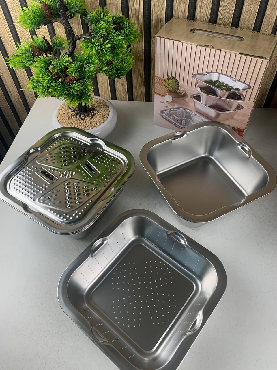 Râpe multifonctionnelle Delaval en acier inoxydable avec panier d’égouttage 3EN1 – مفرمة وقطاعة خضر متعددة الإستعمالات