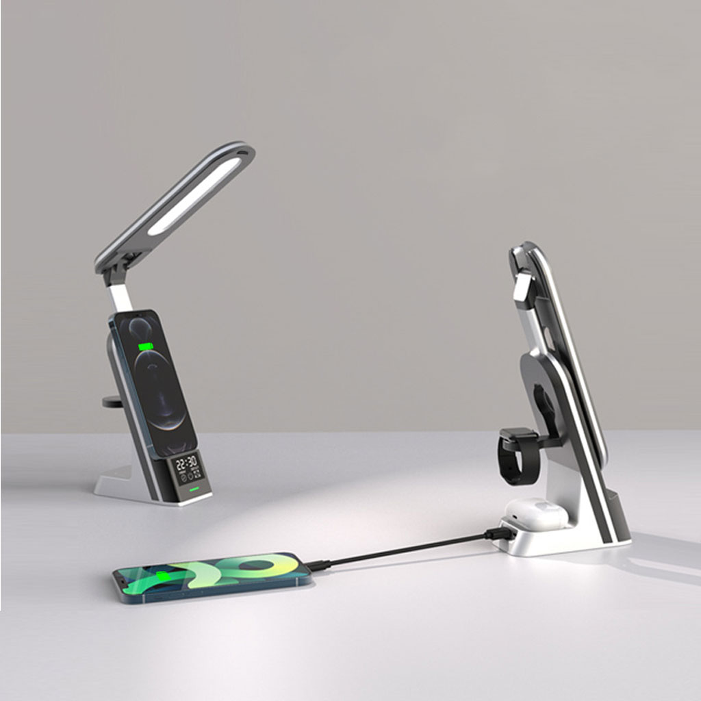 شاحن لاسلكي 7 في 1شحن متعدد الوظائف: يمكنك شحن هاتفك، سماعاتك، وساعتك أثناء استخدام الإضاءة المدمجة.قدرة شحن قوية: أقصى قدرة شحن لاسلكي 15 واط لسرعة شحن عالية.دعم معيار Qi: الشحن اللاسلكي لجميع الأجهزة التي تدعم هذا المعيار.شاحن متوافق مع QC/PD: يجب استخدام شاحن USB بتقنية QC أو PD للحصول على أفضل أداء شحن سريع.جودة عالية وتصميم حديث: مثالي لمنزل أو مكتب أو بيئة دراسة أنيقة.حماية متعددة: يوفر أماناً أكبر لحماية جهاز الشحن الخاص بك..